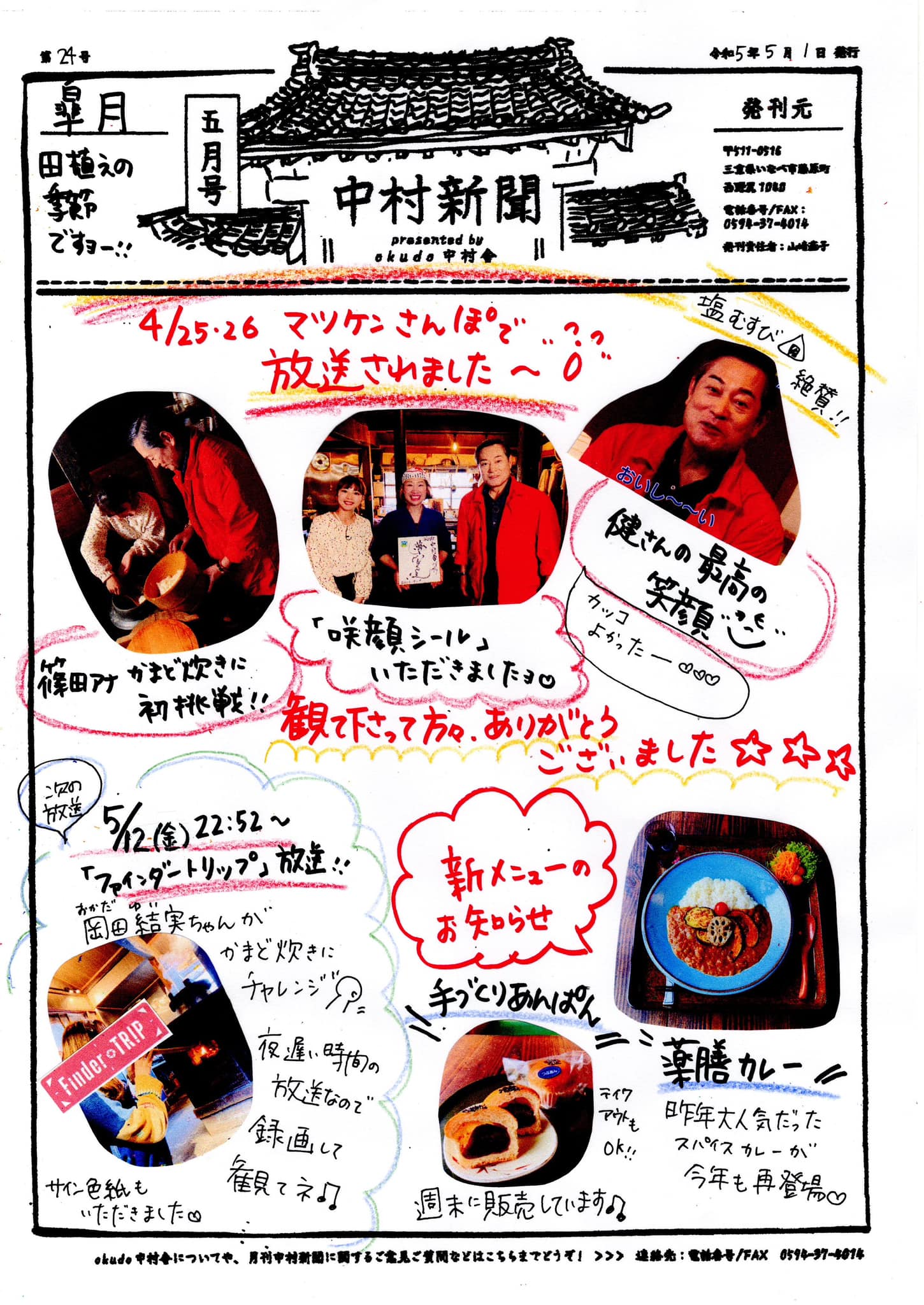 今月も中村舎であった楽しいことやお知らせなどを、手書きで書き描きした中村新聞に載せてお伝えします♫☆お知らせ☆①『中村舎ねいちゃーくらぶ』募集! 年間を通して「もち米」を植えて、稲刈りをして、脱穀して、しめ縄作って、餅つ … 続きを読む 【中村新聞5月号】