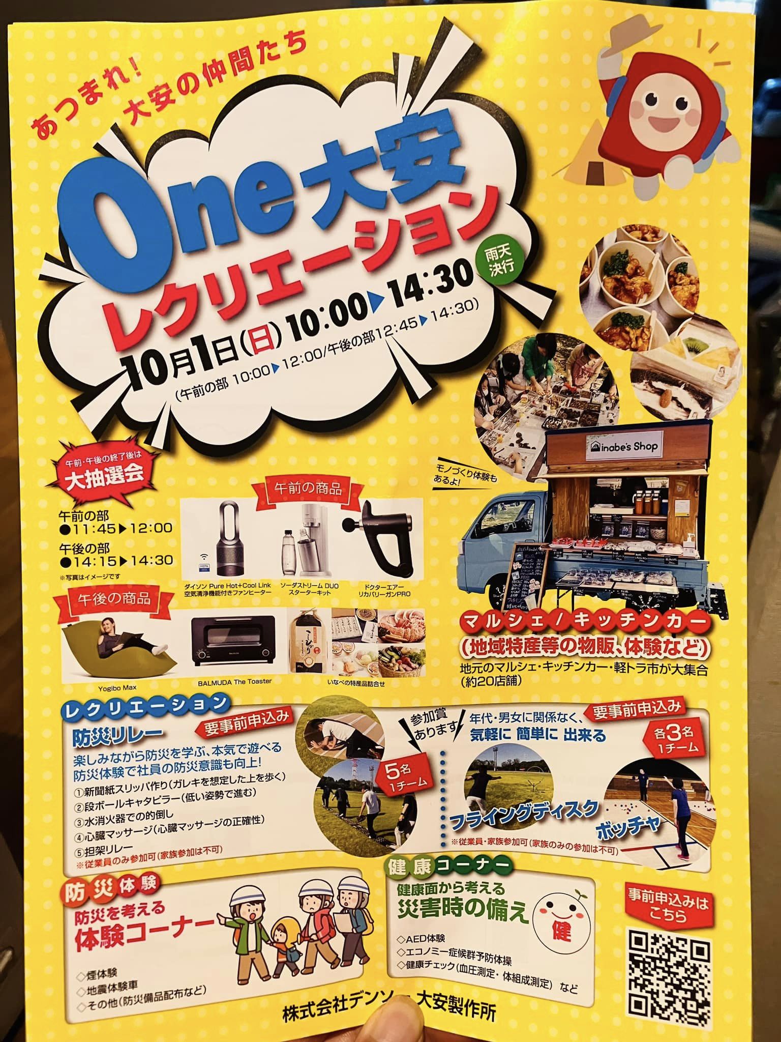 10月1日(日)は、いなべ市デンソー大安工場内で行われる『One大安レクリエーション』に出店します☆防災体験や大抽選会もあるよ!お祭りには、誰でも参加できるのでデンソー内に入って来てください(^^)okudo中村舎は、塩 … 続きを読む 【10月1日デンソー大安祭り】